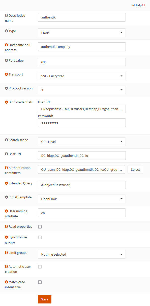 • User DN: CN=opnsense-user,OU=users,DC=ldap,DC=goauthentik,DC=io